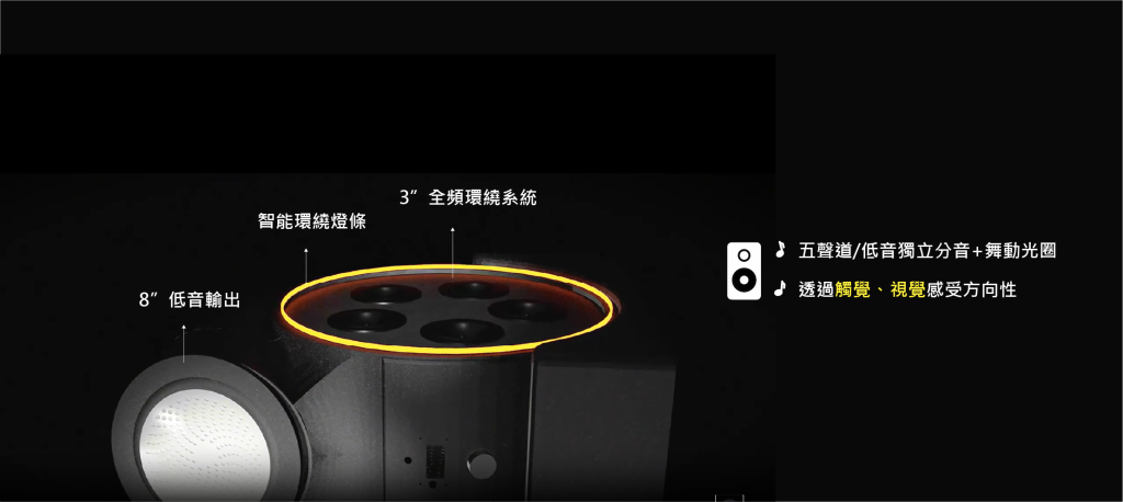 本產品結合觸覺與視覺輔助的多感官音訊系統,透過5.1聲道和分區震動,提升其聲音方向與節奏理解,並鼓勵創作,補足感知缺口。